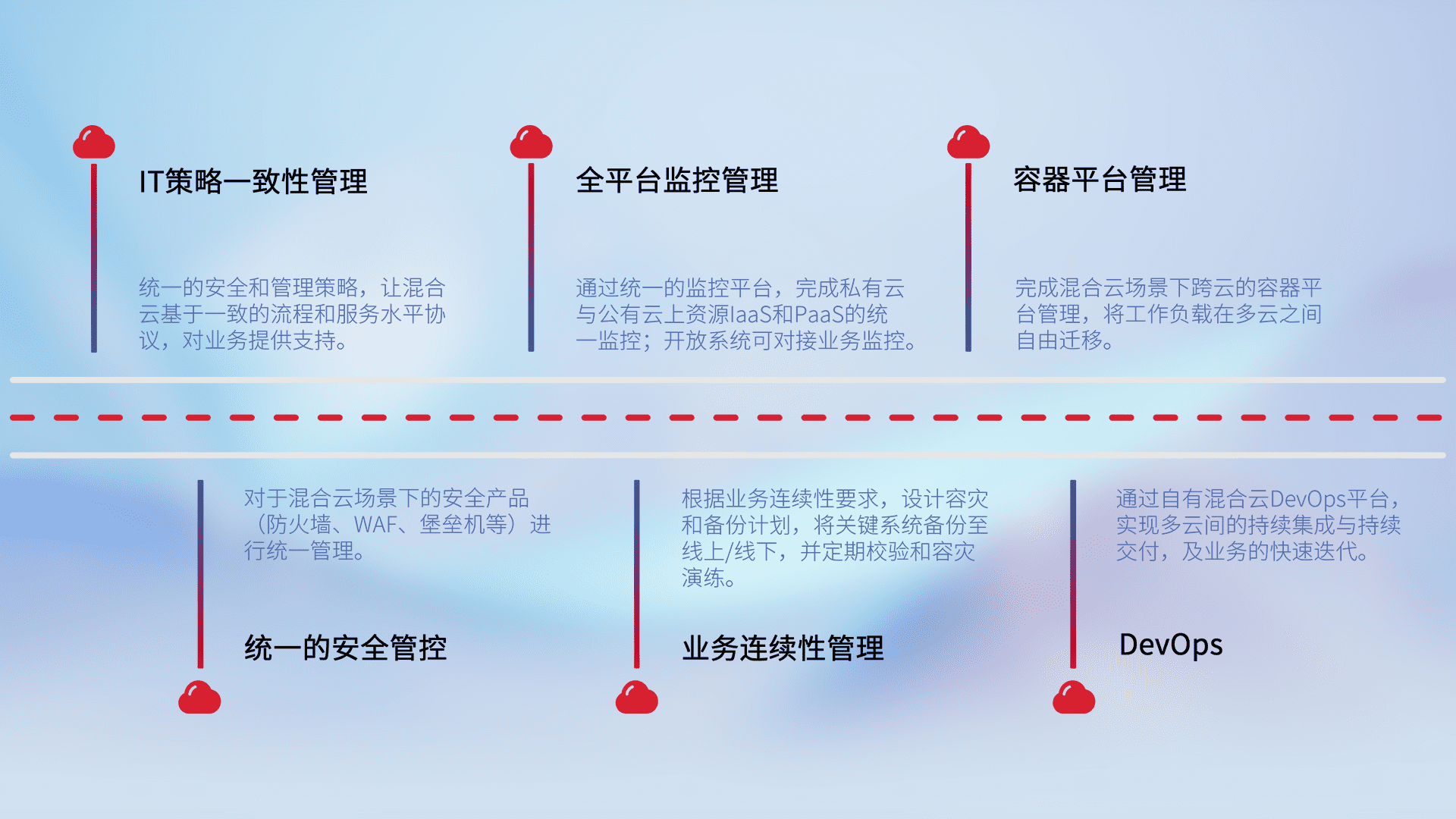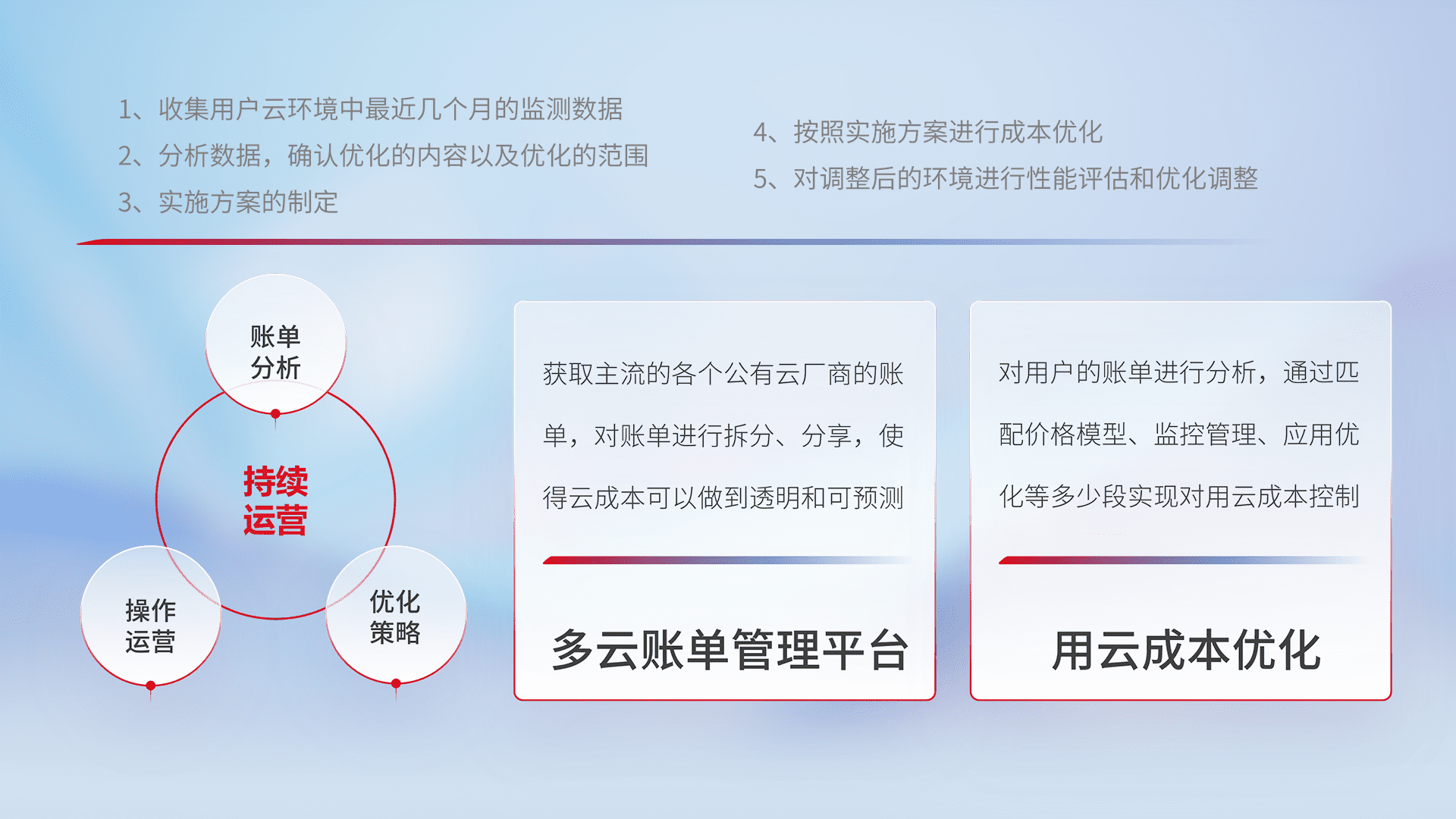 通过多云纳管,,,,以统一的资源数据模型把客户的云资源进行抽象和封装,,,进而实现对多云资源的统一操作,,,,保障云资源管理的可靠性、、、稳定性与可用性。。量身定制化运维内容,,配置、、开发运维、、、、补丁管理、、备份、、、、监控、、、认证和访问管理、、、审计和日常巡检等,,,保障在用云过程中的可靠度,,,,稳定度以及高可用率。。。。